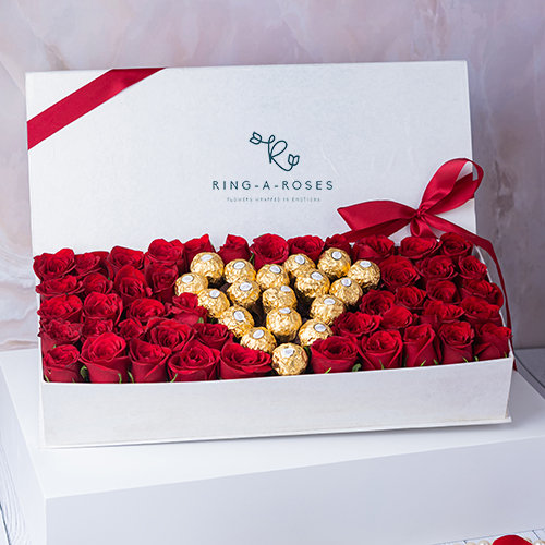 One, two, three, we’ve got a winner! There is no chance that anyone would ever be disappointed with receiving a beautiful bed of red roses, with a heart made of 18 ferrero rocher chocolates.